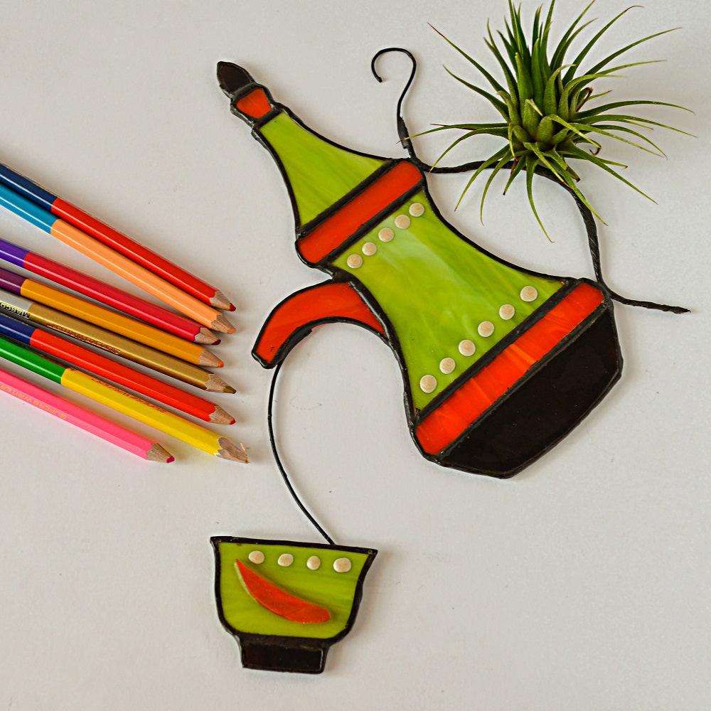 Arabic coffee pot stained glass suncatcher adds a touch of elegance and cultural richness. There is the essence of Arabian hospitality in its design. This window hanging teapot tells a story and invites you to savor the beauty of life, just as you would savor a finely brewed cup of Arabic coffee. It can be a gift or an addition to your own space.