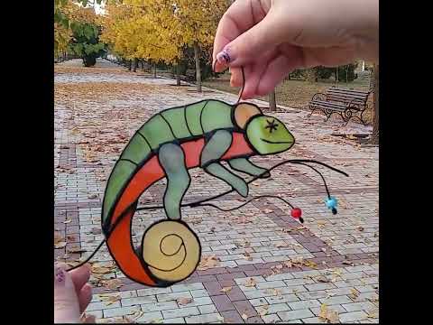 Handmade chameleon stained glass made from glass and it's truly one-of-a-kind. It's a perfect gift for birthdays, anniversaries, or any special occasion. You can easily hang it on a wall, tree, or window, and it adds a touch of artistic brilliance to any room. It's not just for indoors though - you can also use it as a charming decoration in your garden, creating a magical atmosphere.