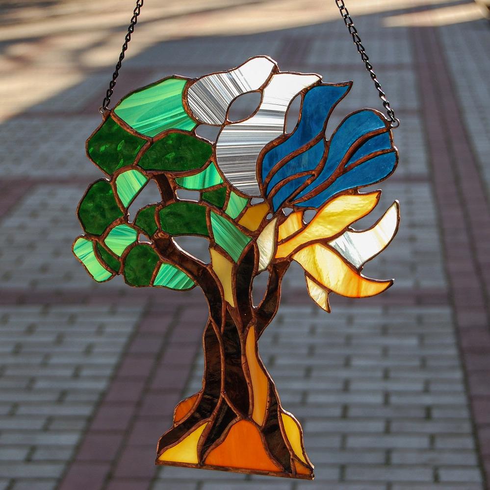 This handmade stained glass tree suncatcher beautifully combines 4 elements of nature into a piece. With elements of Earth, Air, Fire, and Water, this suncatcher brings a touch of nature and balance into any space. Add a beautiful touch to your home with this stunning Life tree stained glass.