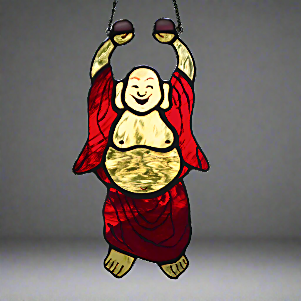 Laughing Buddha stained glass or Hotei is one of the favorable talismans. Plump Buddha is considered a symbol of good luck, abundance, and contentment. is often depicted as a jolly, pot-bellied, bald man with a large smile and a cloth sack. If you have got Happy Buddha, you always have luck, health, and wealth.