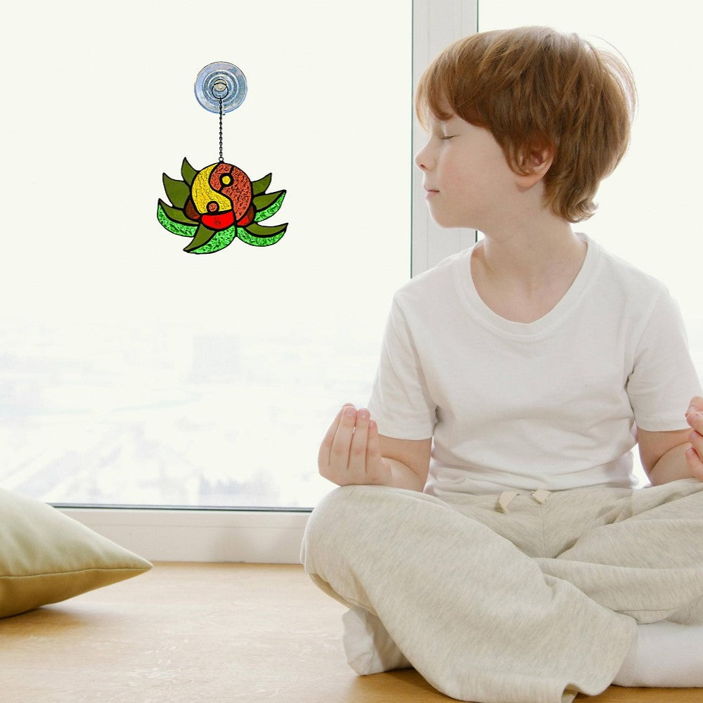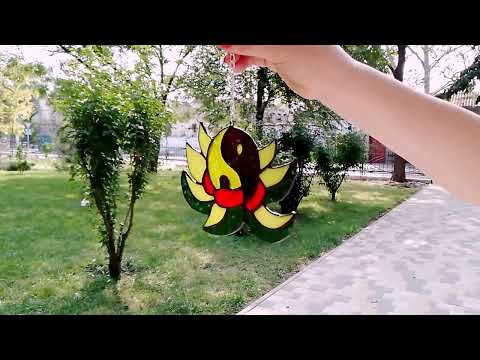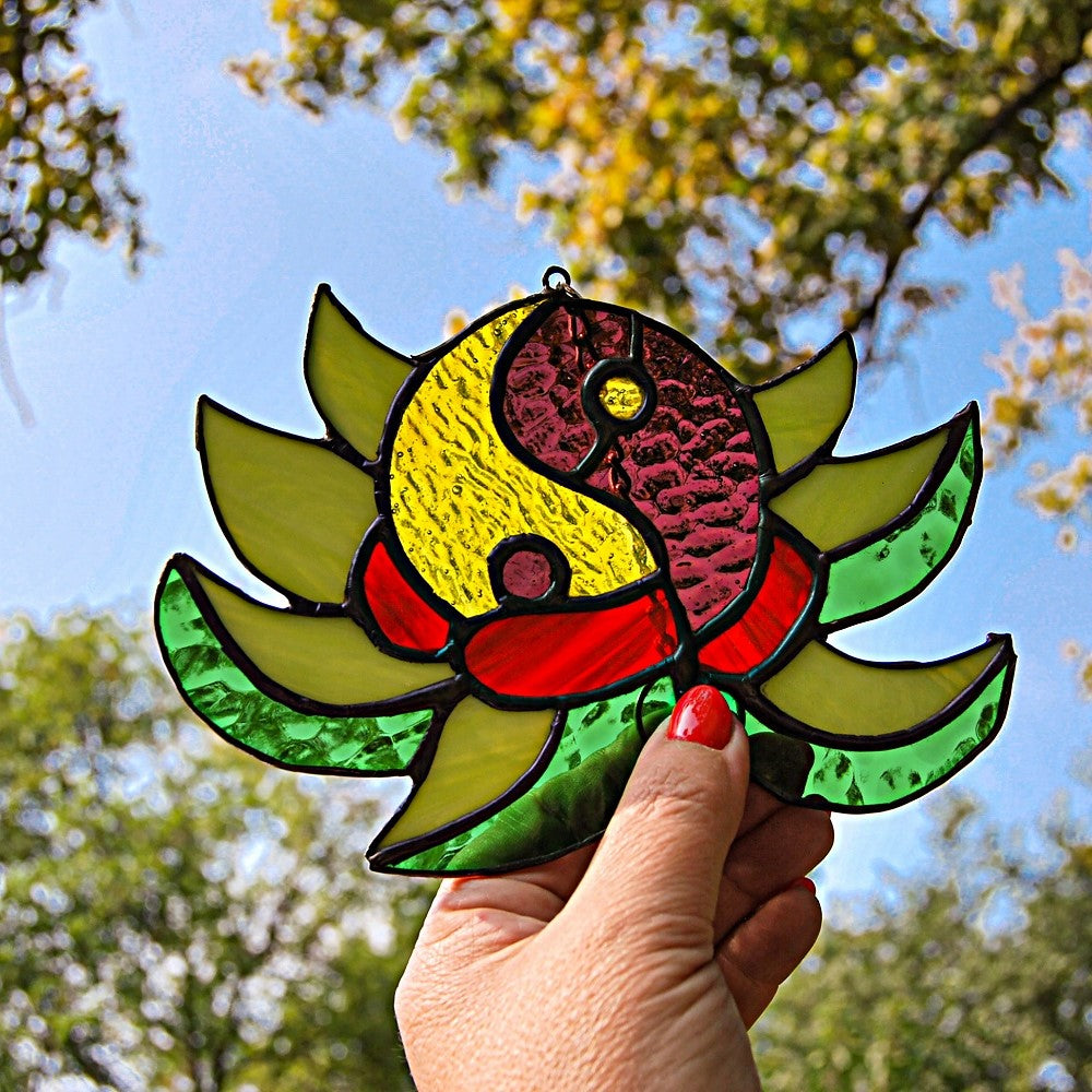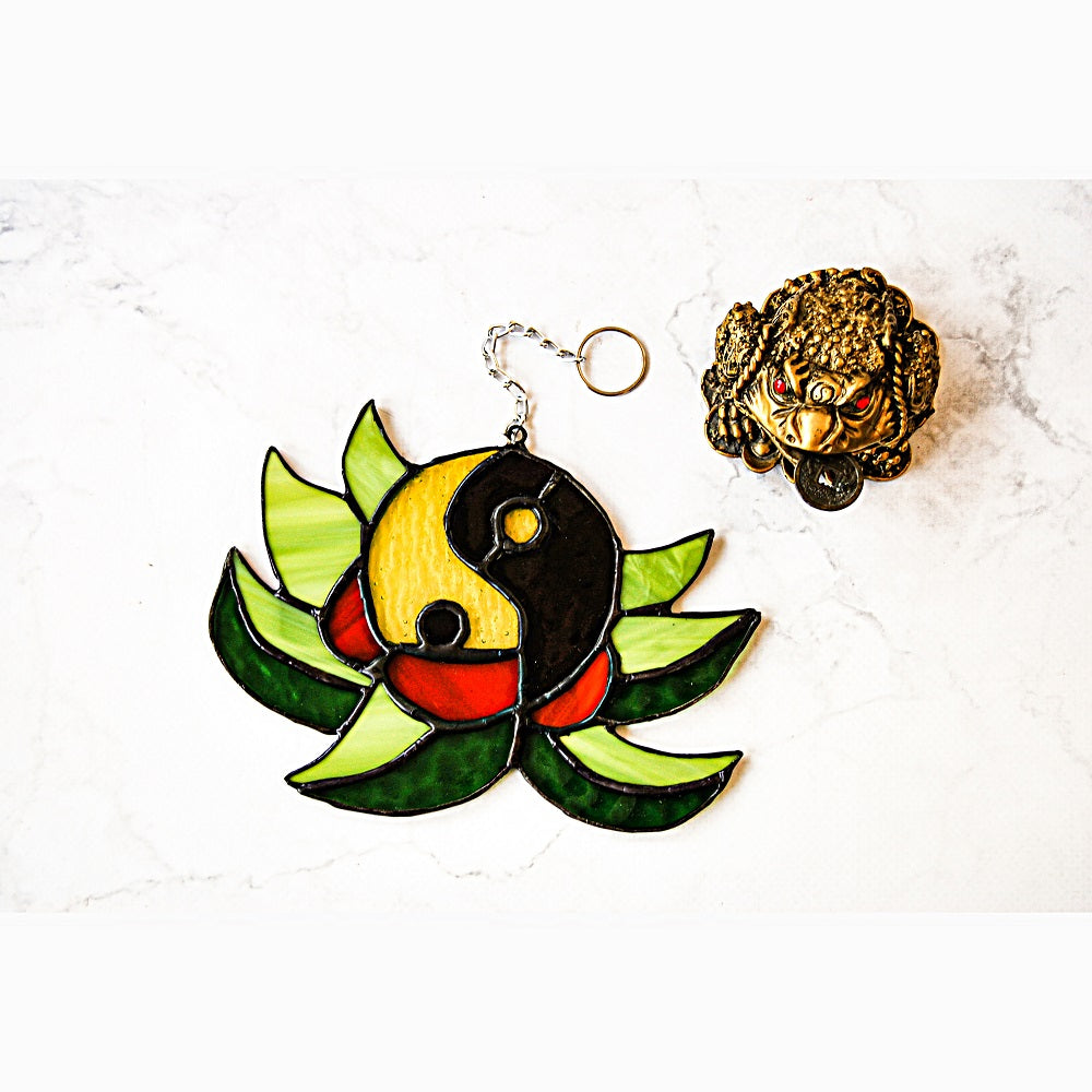 The hanging decoration "Yin-Yang in the Lotus Flower" is an original stained glass ornament crafted with love. The Yin-Yang symbols, representing harmony and balance, are made of yellow and dark purple glass and create a sense of mutual complementarity. The Lotus, presented in red glass with green glass leaves, embodies beauty and sublimity. The hanging decoration is designed to transform your space, filling it with light and energy, while also reminding you of the importance of harmony and beauty in our lives.